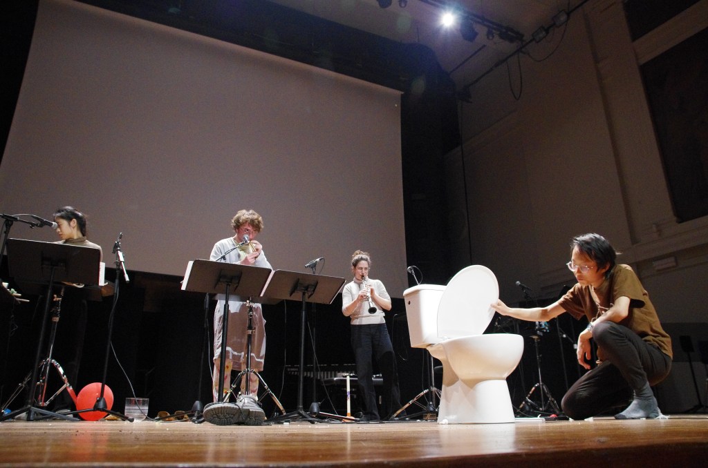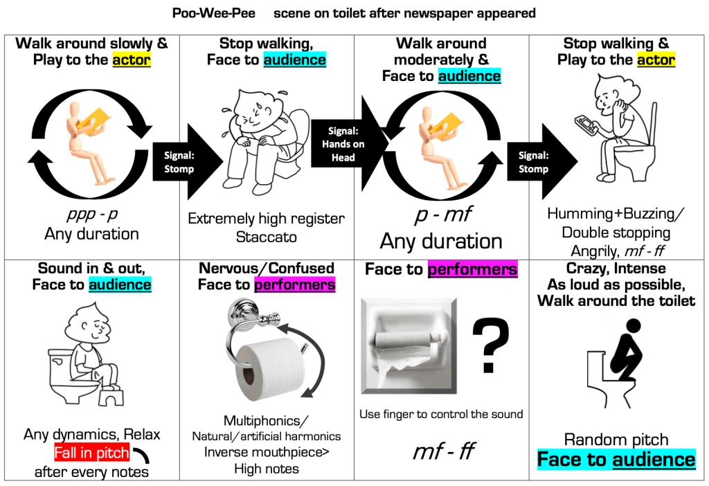 Poo-Wee-Pee is a toilet-related sound project with elements of choreography, installation, contemporary musical performance and animation. The purpose of this project is the reflection on pooping, peeing and farting: Why are they always considered disgusting even though we proceed them every day? Why cannot we treat them seriously? We have spent a lot of time in pooping, peeing and farting throughout our whole life, but have you paid attention to their sound? Do you have time to do it? They are the signal of the body and health, which is why we should pay attention to and respect them. Life is simple. If you can eat, sleep, walk and poop smoothly, your life has been blessed already, while pooping (or going to the toilet) is always ignored. The new presentation of such ‘private’ actions in a public space breaks an invisible wall in our culture: They should not be hidden or avoided in daily life and conversations. They are part of nature and our bodies. They are hilarious but serious!