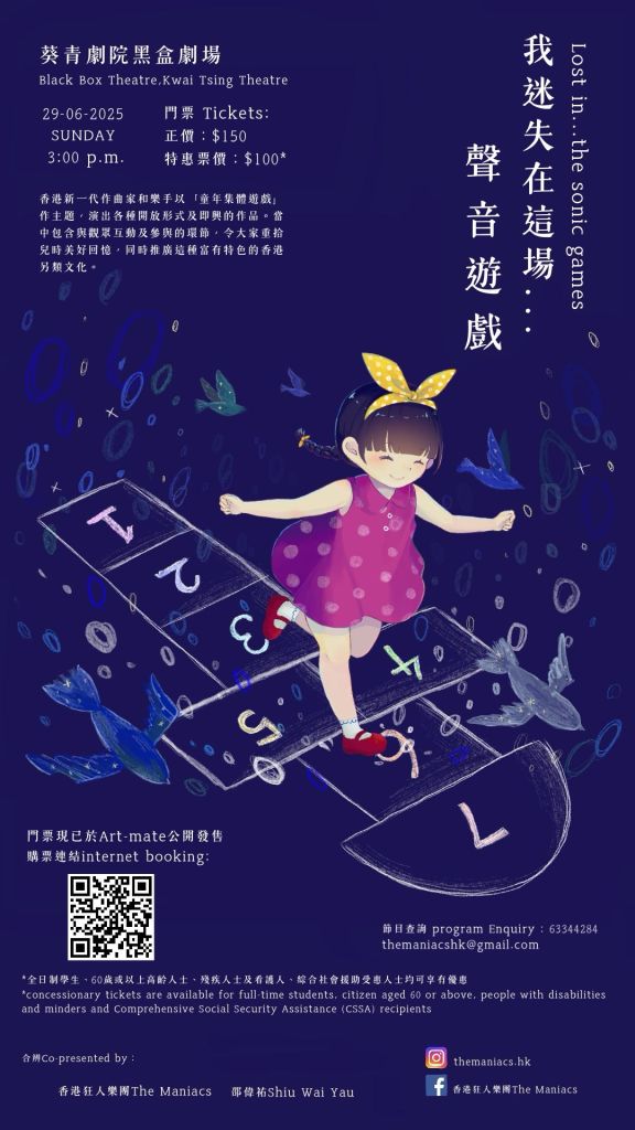 Young composers and musicians from Hong Kong compose and perform open-form and improvisational works from ‘Group games in the childhood’. They include interactive elements and participatory sessions with the audience, recall your childhood memories and promoting this fascinating Hong Kong culture.