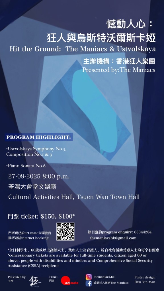 As one of the most distinctive female composers of 20th-century, Galina Ustvolskaya ( 1919-2006 ) revolutionized the understanding of space, religion, and listening through her groundbreaking works. Her pieces, characterized by their powerful intensity, dissonant harmonies, and unique instrumentation, have seldom been performed in Hong Kong.